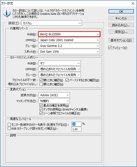 2. RGBのプルダウンの中から自分の使っているモニタの名前っぽいやつを選択